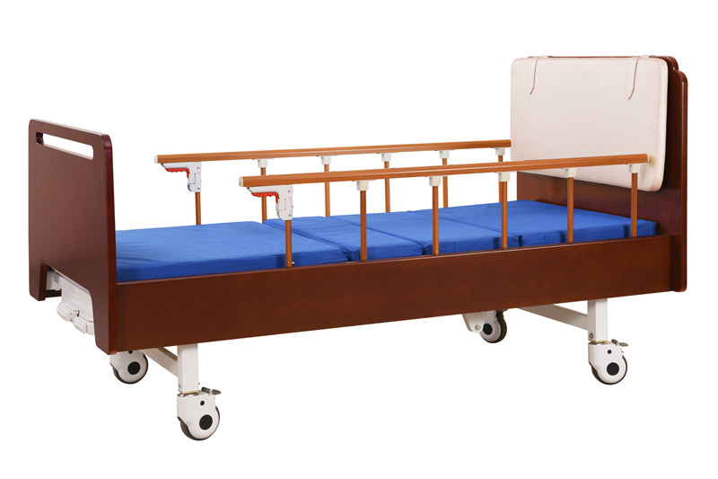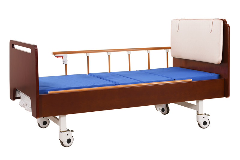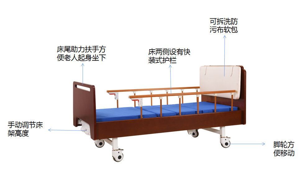 護理床 基材:為實木白蠟木框架結構 大圓角設計,安全,保護您的老人住戶不易受傷; 床尾可作為扶手使用,還可防止被子掉落等,方便護理; 床底鏤空設計,方便清潔地面以及防潮; 實木框架結構,經久耐用 手動調節床架高度