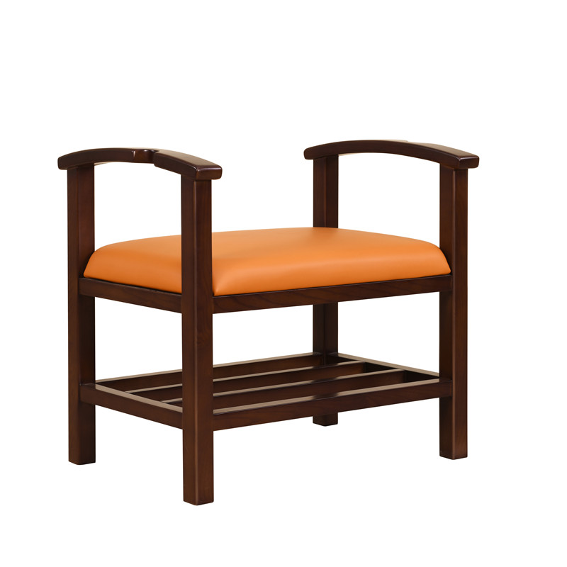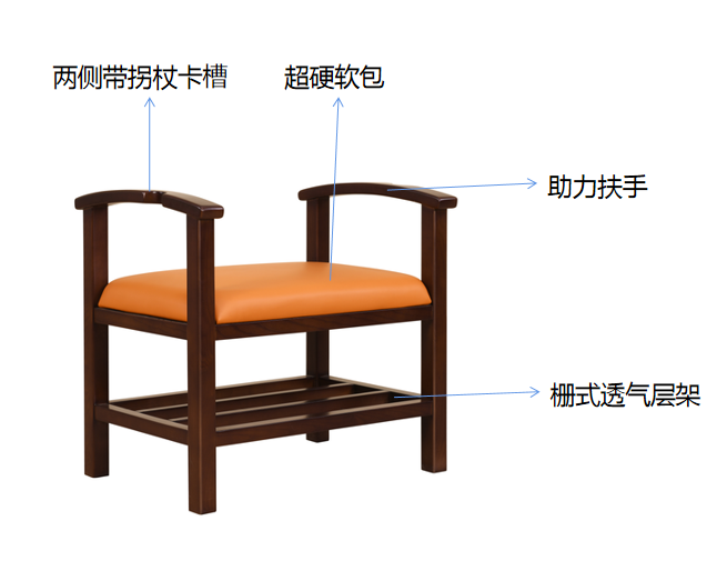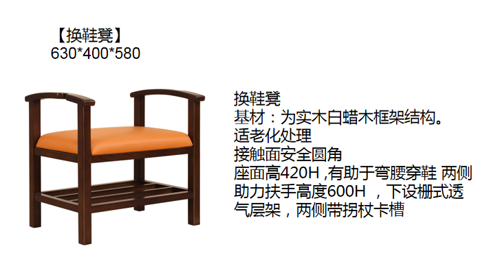 換鞋凳 基材:為實(shí)木白蠟?zāi)究蚣芙Y(jié)構(gòu)。 適老化處理 接觸面安全圓角 座面高420H ,有助于彎腰穿鞋 兩側(cè)助力扶手高度600H ,下設(shè)柵式透氣層架,兩側(cè)帶拐杖卡槽