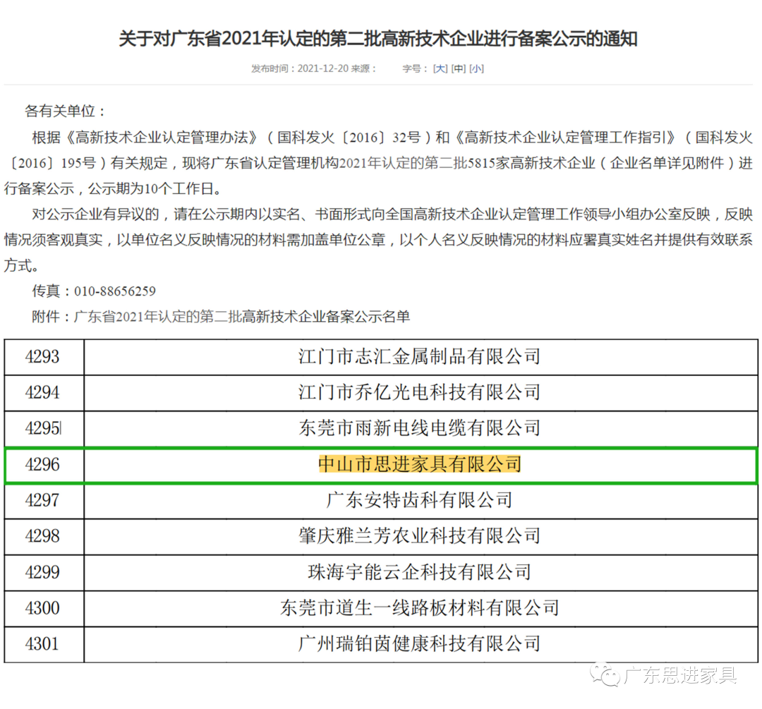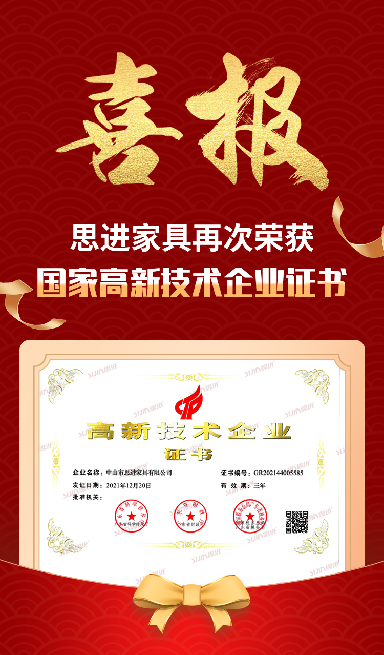 經(jīng)廣東省科學(xué)技術(shù)廳、廣東省財政廳 、國家稅務(wù)總局廣東省稅務(wù)局等有關(guān)部門的嚴格評審。中山市思進家具有限公司順利通過高新企業(yè)認證。繼2016年思進家具獲得高新技術(shù)企業(yè)認定以來,2021年復(fù)評再獲高企認定(2022年發(fā)證),充分體現(xiàn)了思進家具經(jīng)營管理水平及科技創(chuàng)新能力。